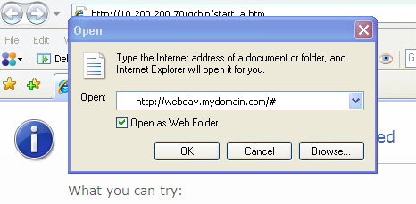 Back home after your work day, during which you wrote and published the meeting report ( plus a few other things I hope ), you suddenly figure out that you accidentally forgot to add, on your intranet, the useful resources discussed during the meeting. Among other, you promised to upload the latest version of Exponential, for those who still do not have it installed on their laptops ( side note : which is unacceptable ). At work, you were using Nautilus, under linux, to work on Exponential through WebDAV. Here at home, there's not the slightest trace of a linux computer. Neither of a Mac one. Let us use Internet Explorer as a WebDAV client.