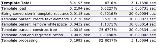 You can see that time is spent parsing the text and constructing the internal template execution tree before the template is actually processed. This is not necessary.