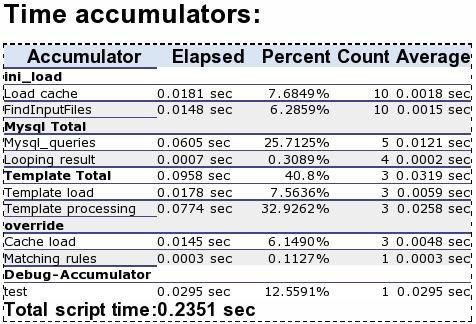 This section of the debug output displays timing information about various parts of the system, such as template processing, character set conversions, XML processing and information about SQL queries. This section also displays the results from the debug-accumulator template function.