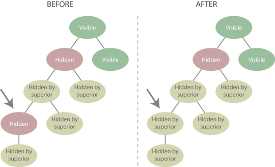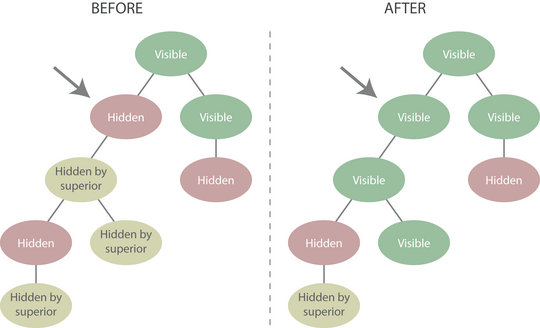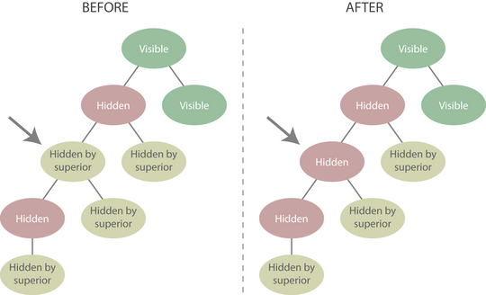 Observe the change from being hidden to visible for the target node. Its descendants also become visible. However, notice in particular that the propagated effect stops when a node with the "hidden" status is encountered. If a node has a "hidden" status and one of its ancestors becomes visible, the node will remain hidden and its descendants will remain invisible.