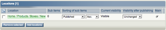 Once you have published an object (visible or invisible), it is part of the content node tree and thus you will be able to add sub-items to it. For example, you can publish an unfinished article as hidden, then create sub-pages for the article, and finally reveal the hidden article (and its sub-pages) when ready. This is handy since you cannot add sub-items to Draft objects (which do not yet have a location). The edit mode Locations window is disabled for all subsequent versions of the object.
